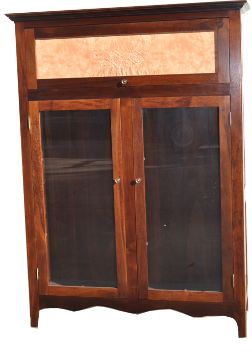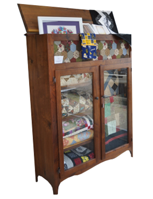My original designed Quilter’s Cabinet is designed for the quilter to display prized quilts. The two mortise and tenon door frames open to spacious shelves that hold folded quilts. Another option is to hang the quilts for viewing. The top section contains a door that has a fabric panel that can easily be changed by the owner. I can easily custom size this cabinet for your display area. Overall dimensions are 50” wide x 14” deep x 60” tall. The original design is with a hinged lid but has been replaced with a barrister bookcase style lid.