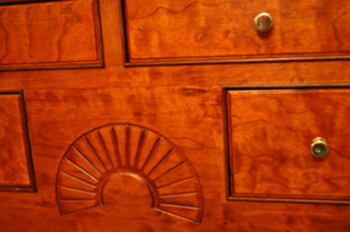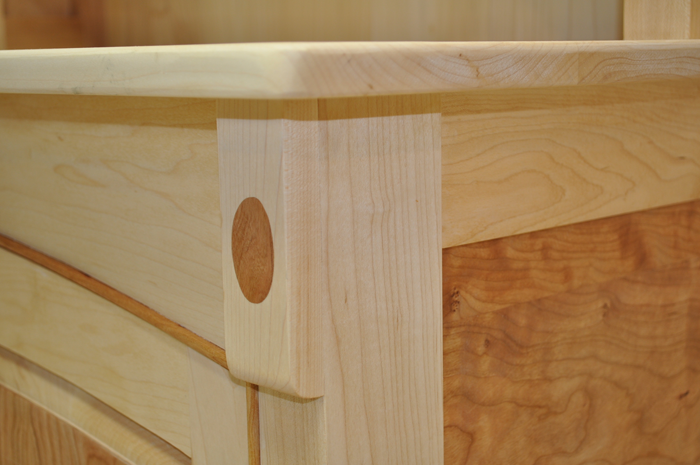 This custom designed Country Hutch is built from maple, cherry, curly cherry with walnut as an accent. The raised panels are book matched curly cherry laminated onto maple. Beveled oval glass highlights the doors on the upper section. Inlaid cherry ovals and antique brass oval knobs decorate the lower section. Hand cut mortise and tenon joinery strengthen this piece while hand carved lamb’s tongue soften the chamfered front edges. Overall dimensions are 84” tall x 41” wide x 21” deep. NFS