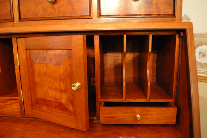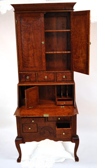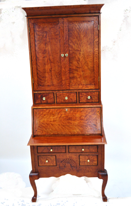 Queen Anne drop front secretary is built from curly cherry and cherry with walnut as an accent. Ash is used as the secondary wood. The hand carved fan highlights the lower section while book matched curly cherry panels highlight the middle and upper sections. Dovetailed joinery is used on the case pieces and all drawers. Two hidden compartments are utilized to store valuable documents. Overall dimensions are 36” wide x 22” deep x 87” tall. NFS
