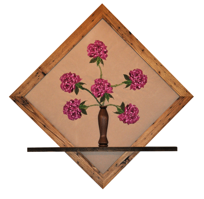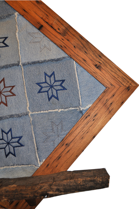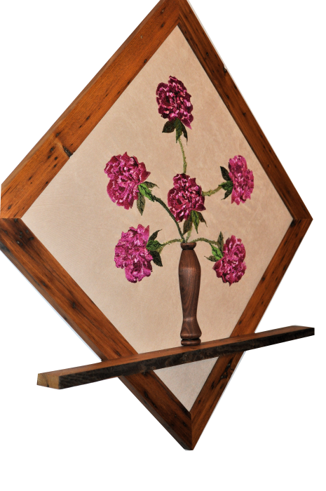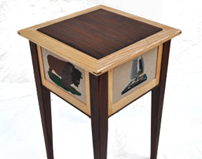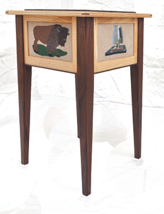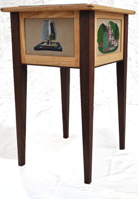 We offer a unique end table made of contrasting woods, spalted maple and cherry, and 4 original design embroidered panels. The “Four Seasons” Table features a West Virginia farm scene depicted in Spring, Summer, Fall and Winter. The table measures 18″x18″x27″. Contact for purchasing information.